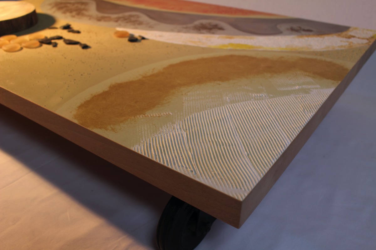 Artistic table made by hand. Walnut and non toxic water-based paint. Mixed technique. Painted by hand.