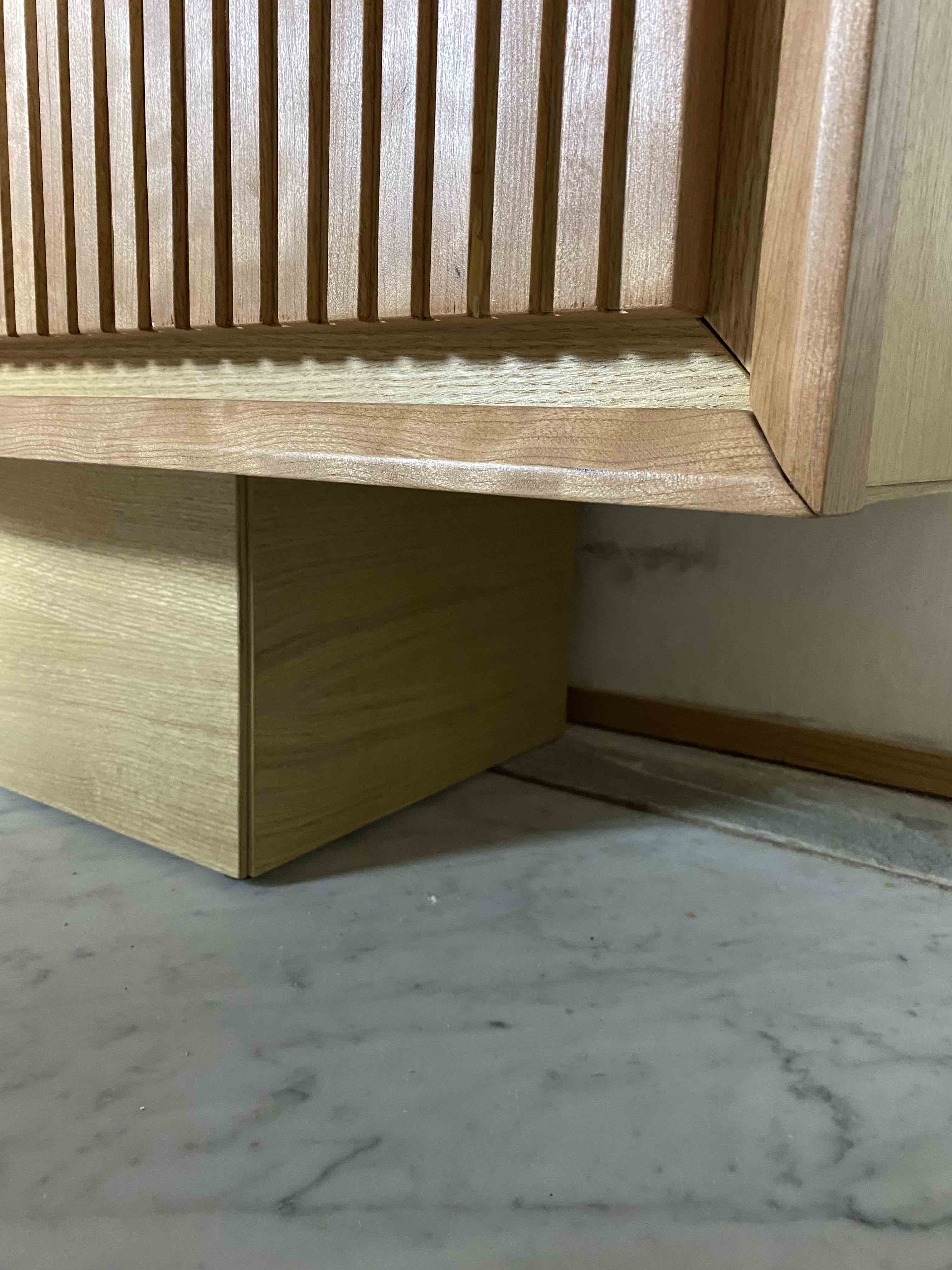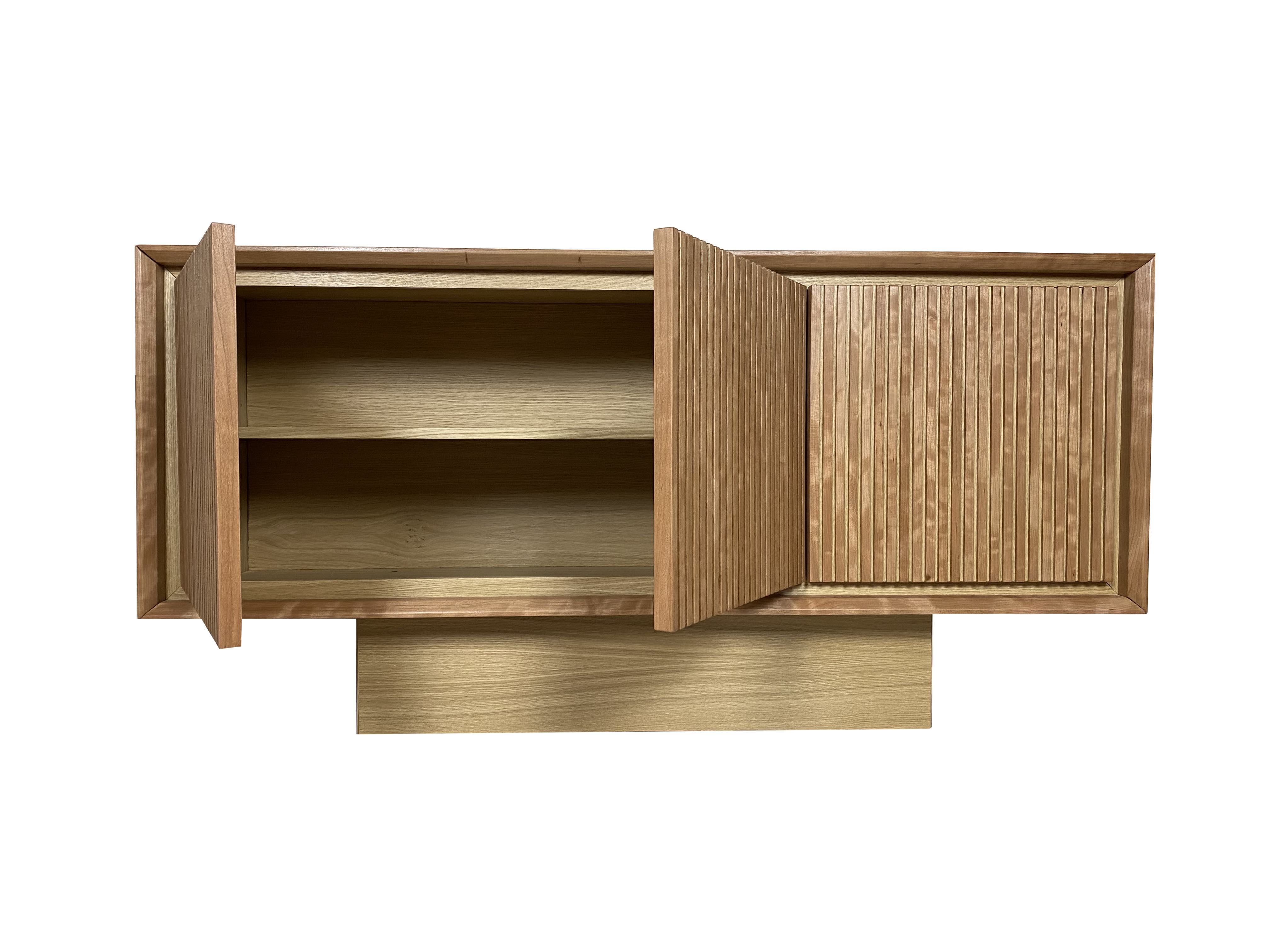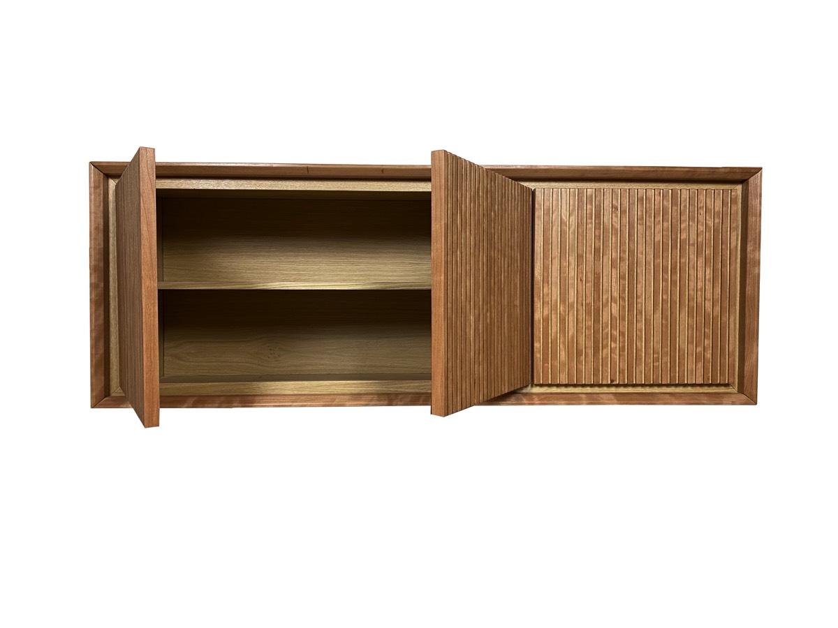 Suspended sideboard. In oak and cherrywood with three doors.