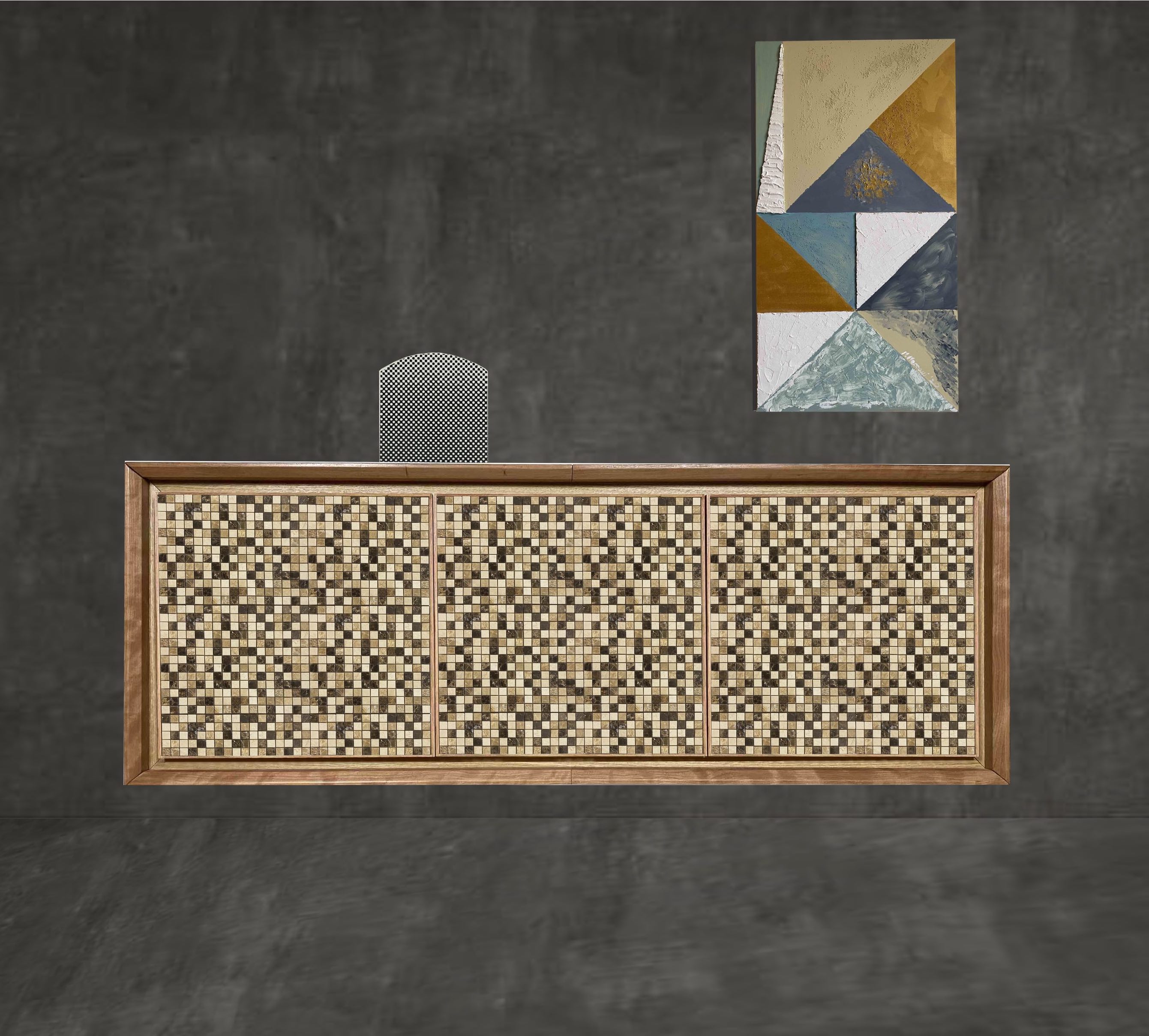 Sideboard in oak with cherrywood and walnut finishes, four doors and internal shelves.