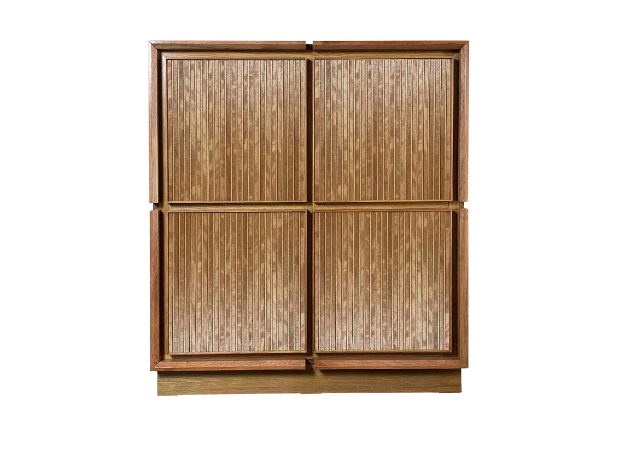 Sideboard in oak with cherrywood and walnut finishes, four doors and internal shelves. On the doors inlay in maple and wengé