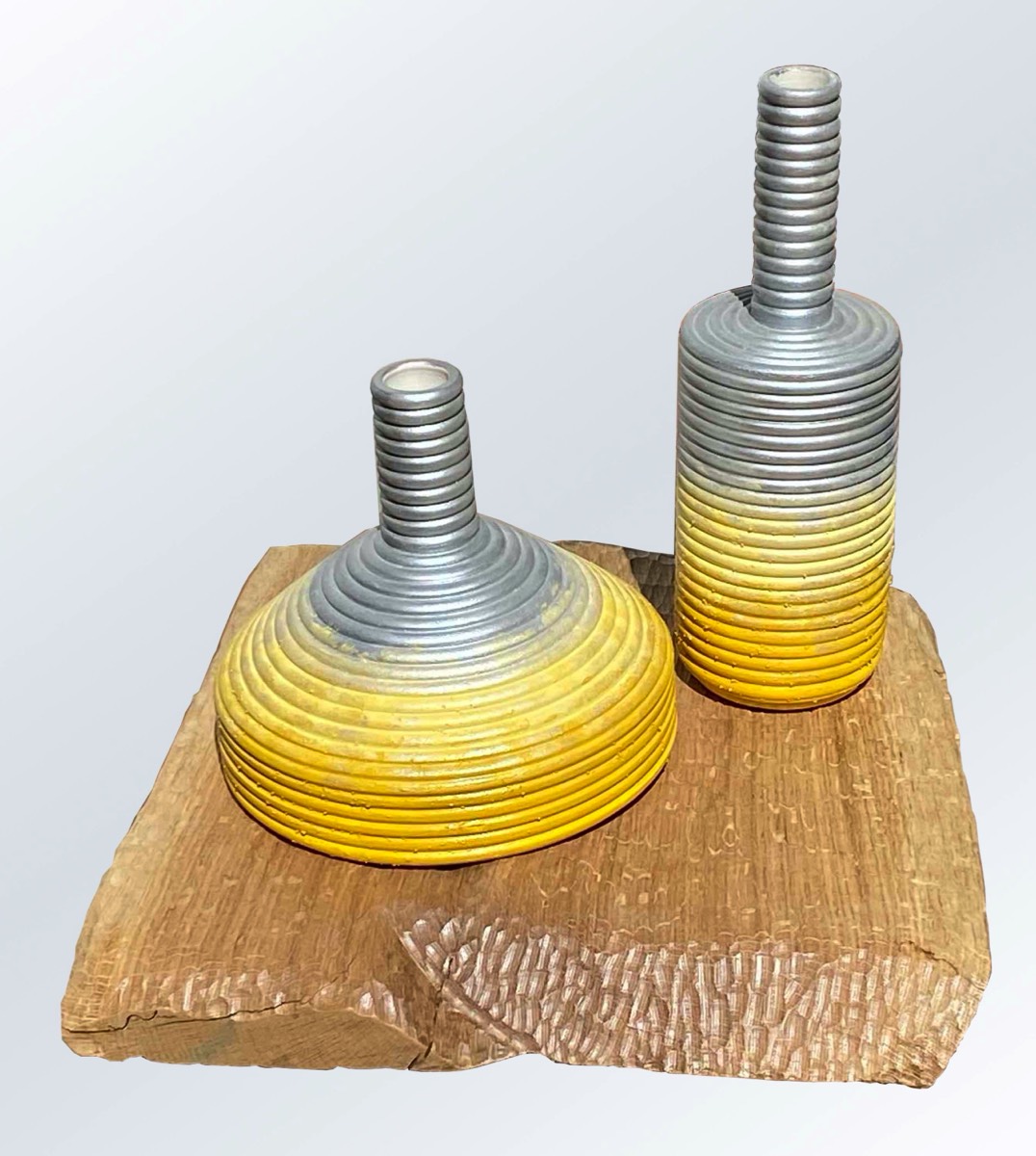 Handmade "biscuit" terracotta vase decorated with mixed hand technique. Base in hand-carved oak. Single piece.
