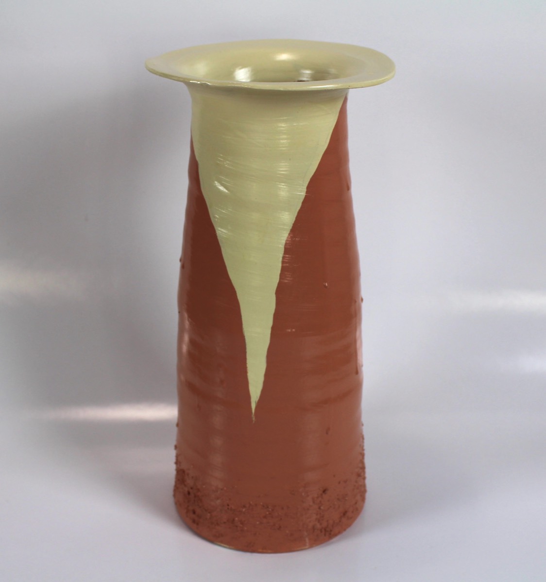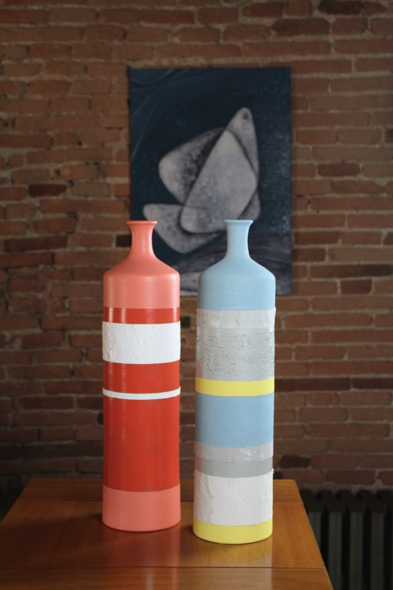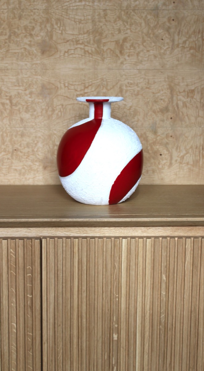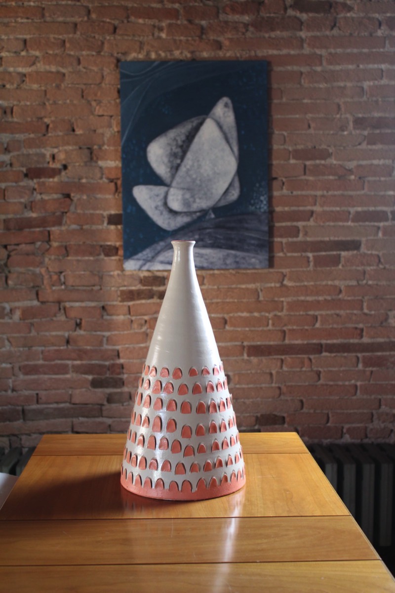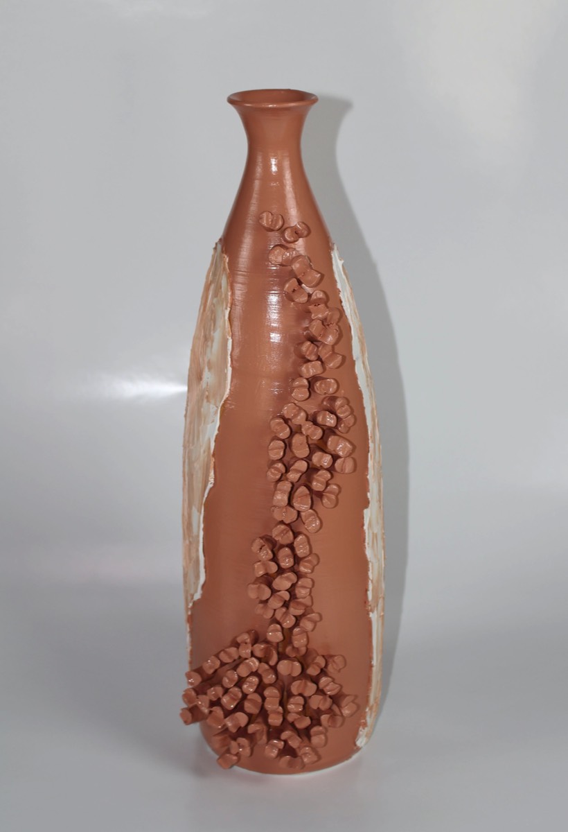 Vases in red or biscuit terracotta turned and painted by hand with mixed media.