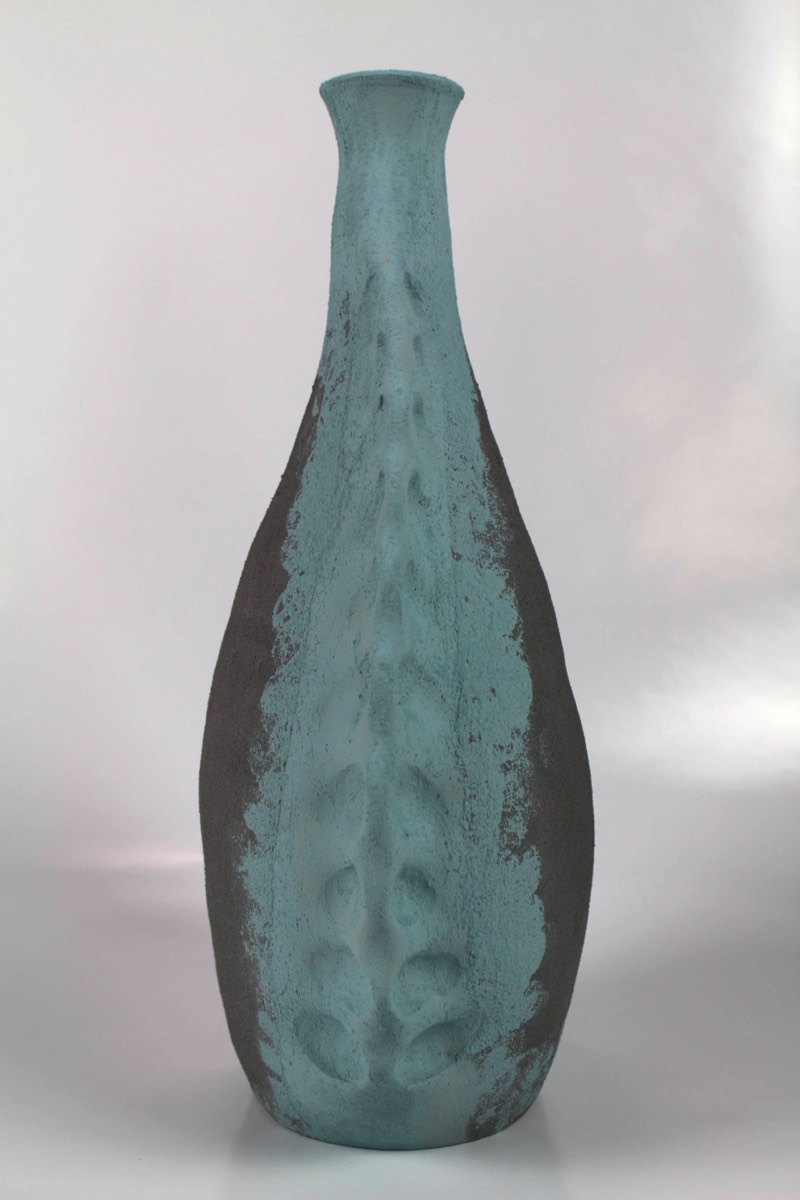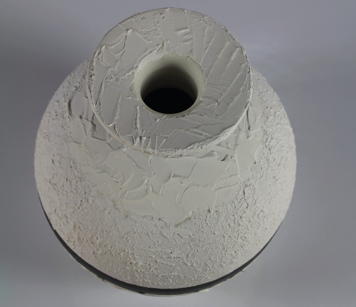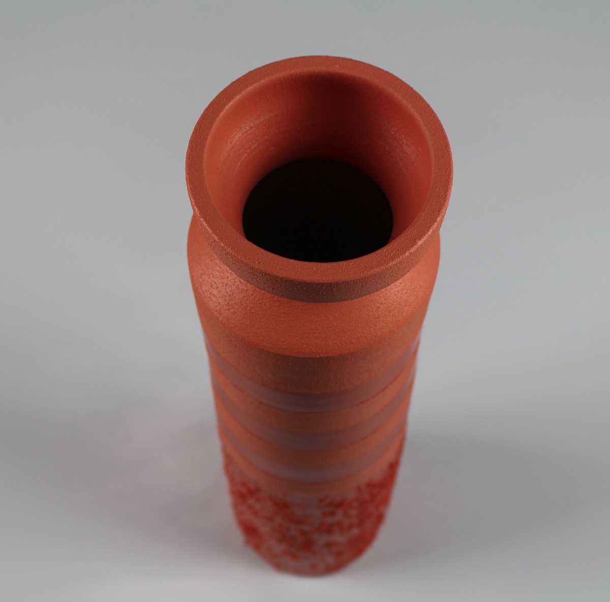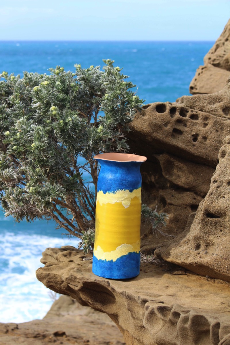 Vases in red or biscuit terracotta turned and painted by hand with mixed media.