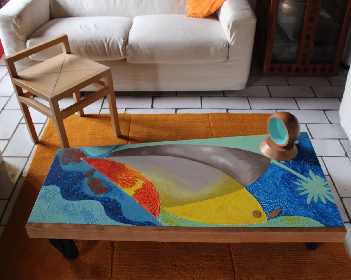 Artistic table made and painted by hand. Wood and non toxic water-based paint. Decorated by hand. Maple frame.