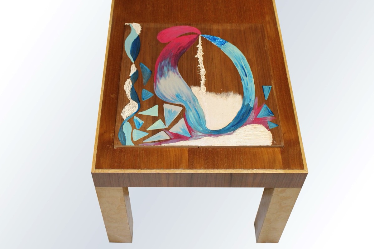 Artistic tables made and decorated by hand. Wood and non toxic water-based paint. Decorated by hand. In wood with walnut and ash burl finish.