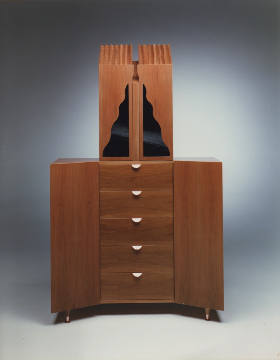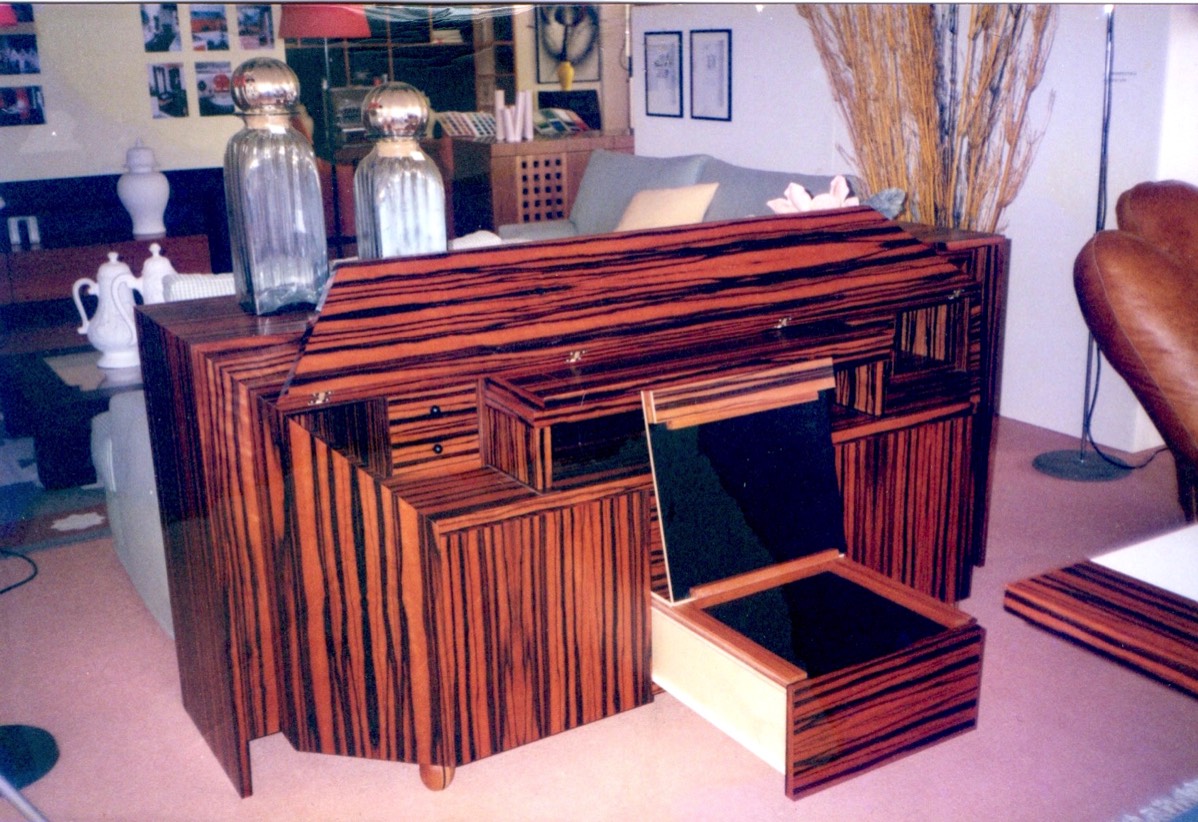 Description, cupboard with 4 doors with top in ash-wood briar, maple-wood and pear-wood