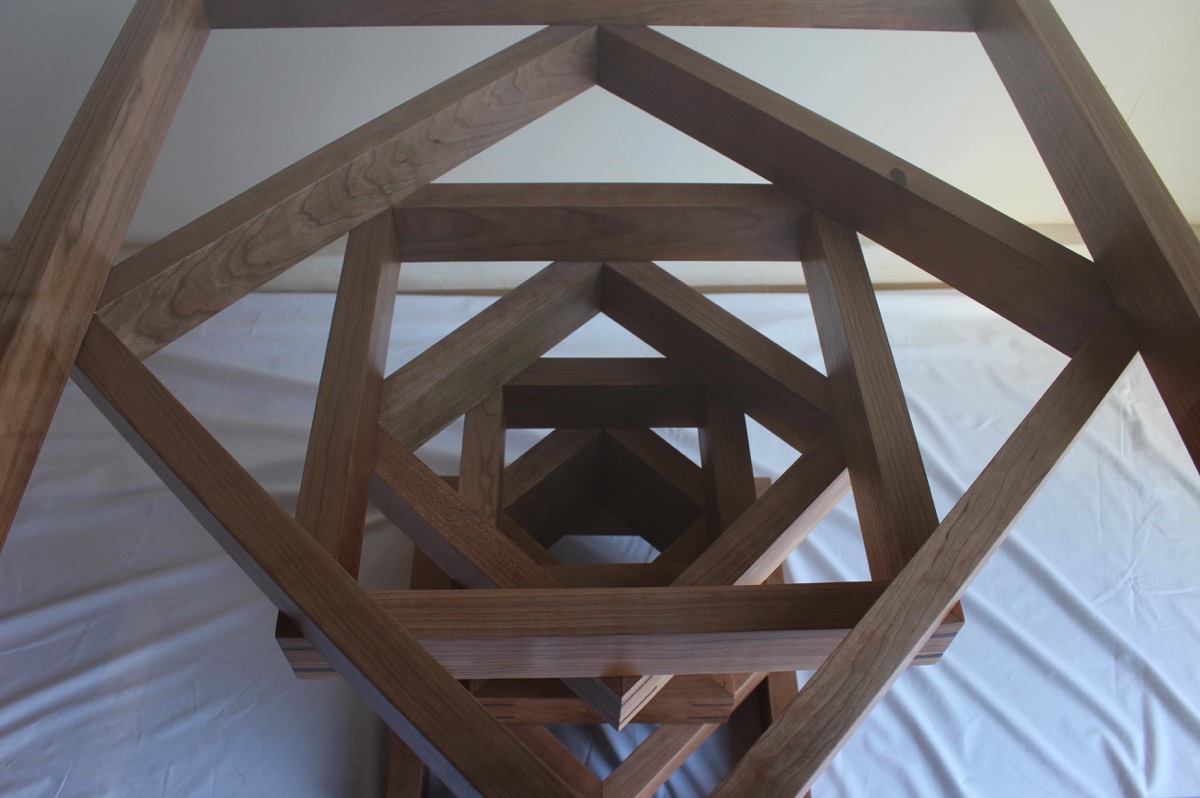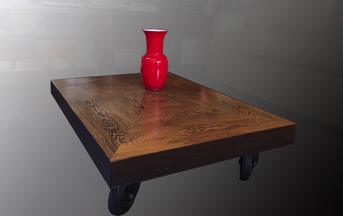 Description, small table of four handcrafted trunks shaped by hand in dark walnut , oak , cherrywood , maple and sixteen satin lacquer . Polishing wax without solvents and water lacquer