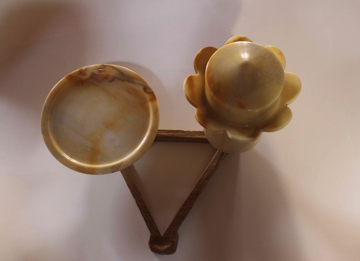 Description, Tuened marble "Giallo Siena" and carved oak base.