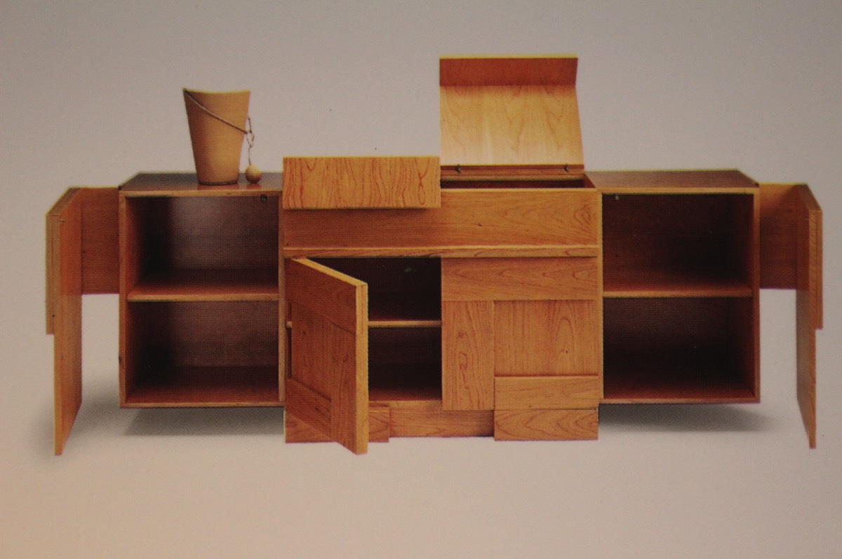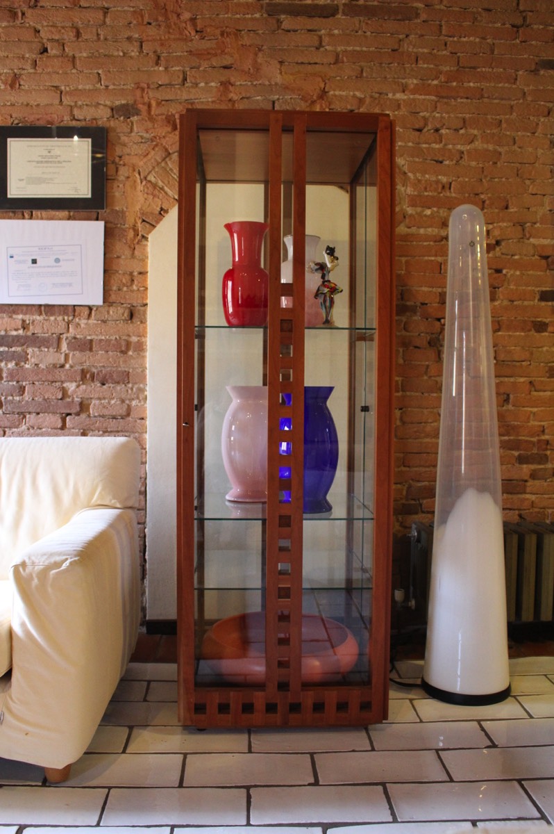 Description , base in wenge' , colored volumes with satin lacquered , black , yellow , pink , red , celestial , vertical root element , cherrywood columns and wenge' stained oak , blue glass .