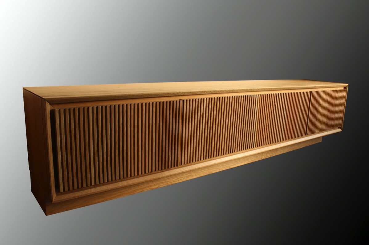 Description, sideboard suspended in oak with three doors and two shelves. Sideboard with four doors and two shelves.