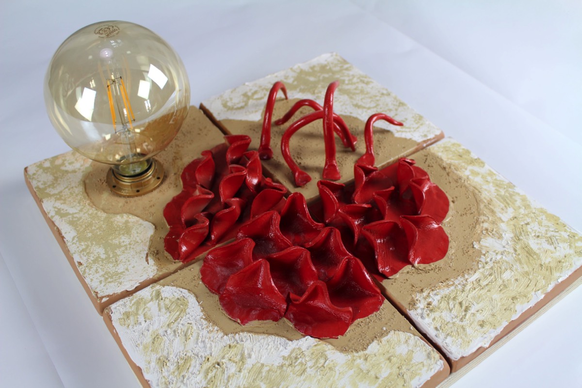 Handmade and decorated terracotta wall lamp.