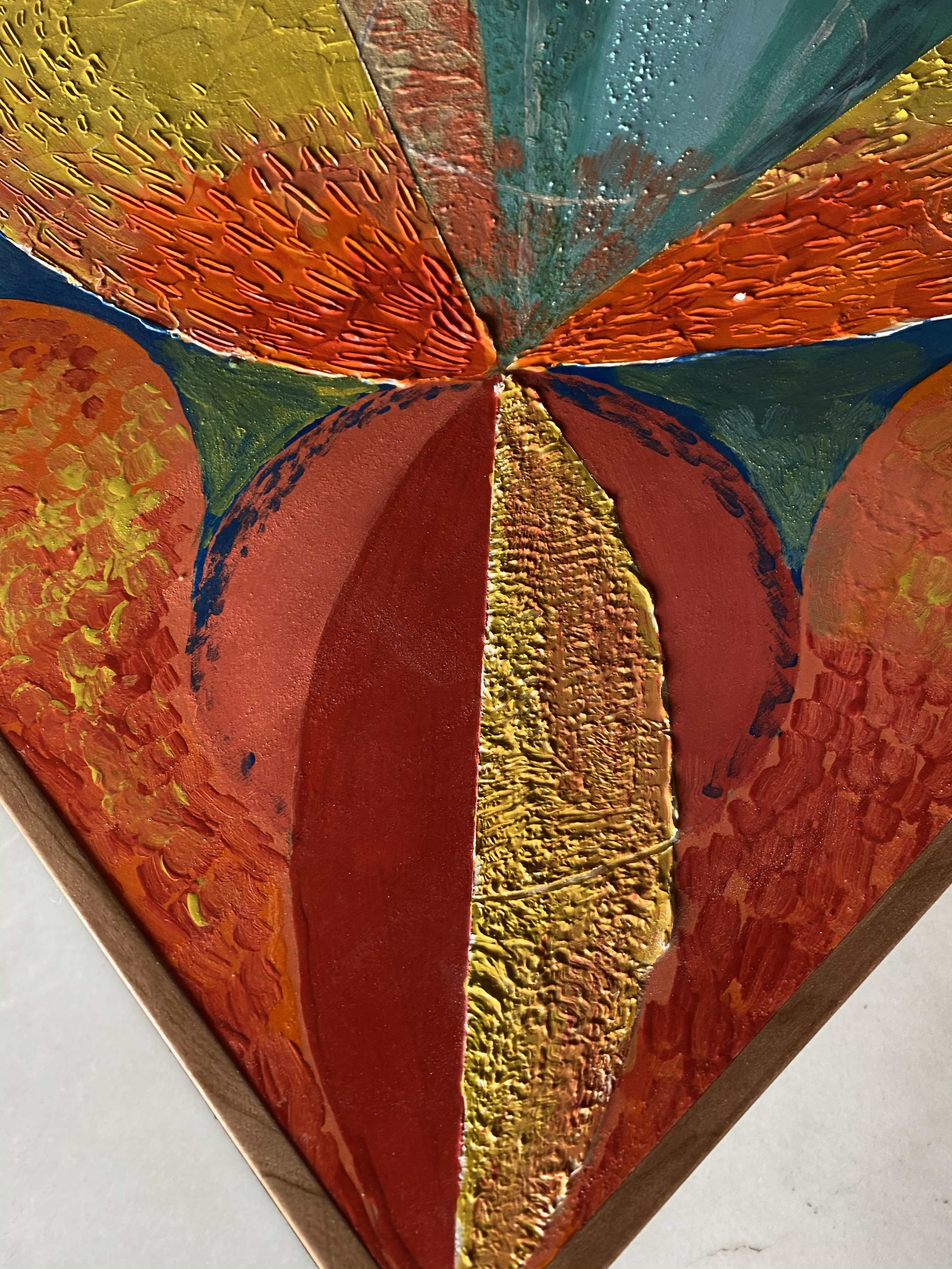 Artistic tables made by hand. Terracotta base made on the lathe and decorated by hand with mixed technique. Wooden top decorated by hand with mixed technique with stucco and send.
