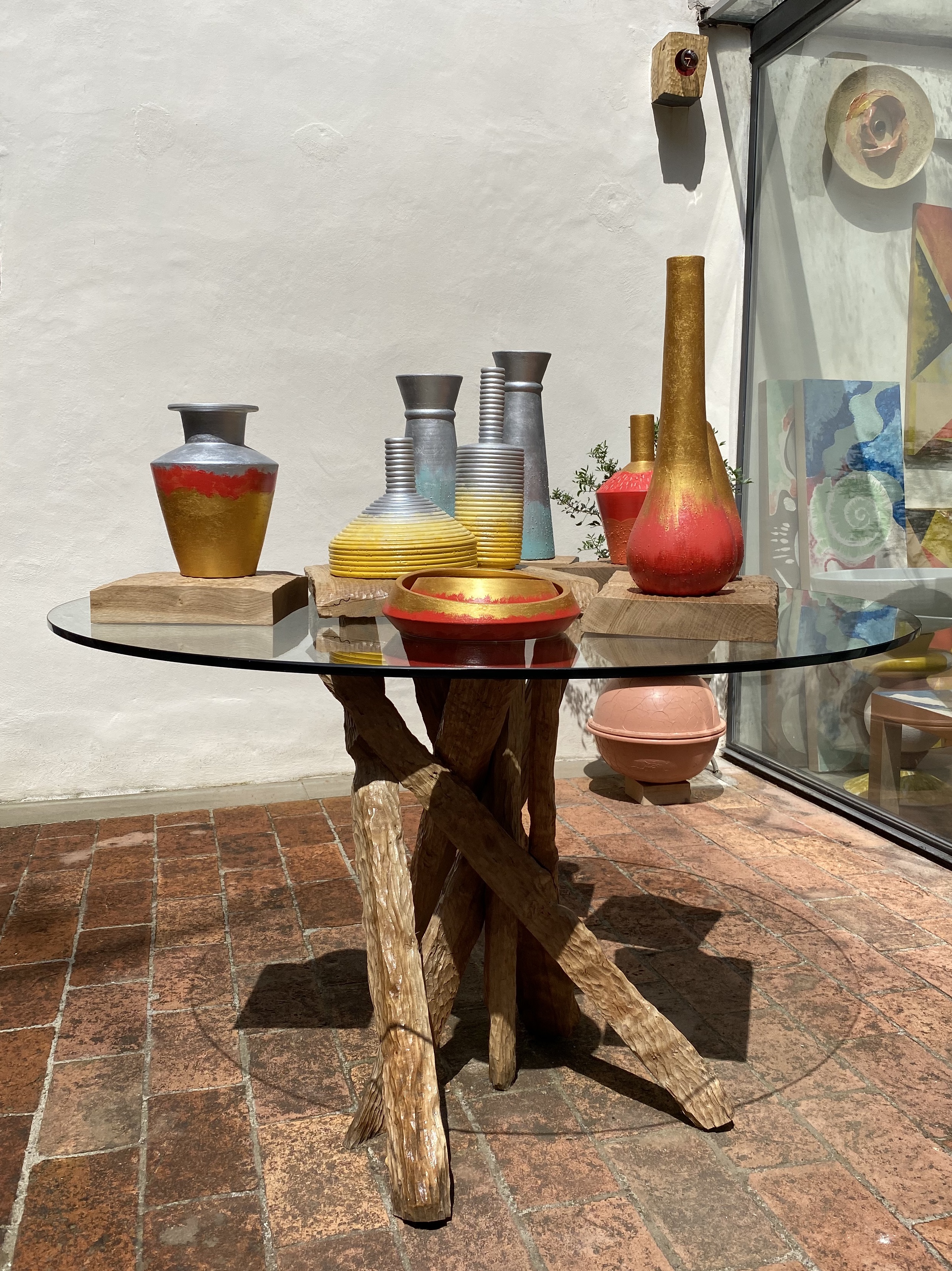 Round table with turned ceramic base and handmade glass top.