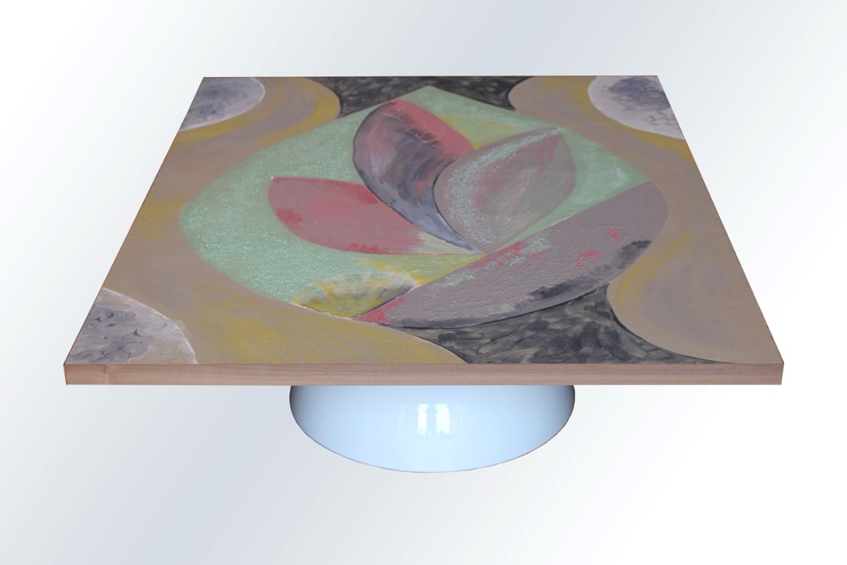 Artistic table made and decorated by hand. Turned white ceramic base.