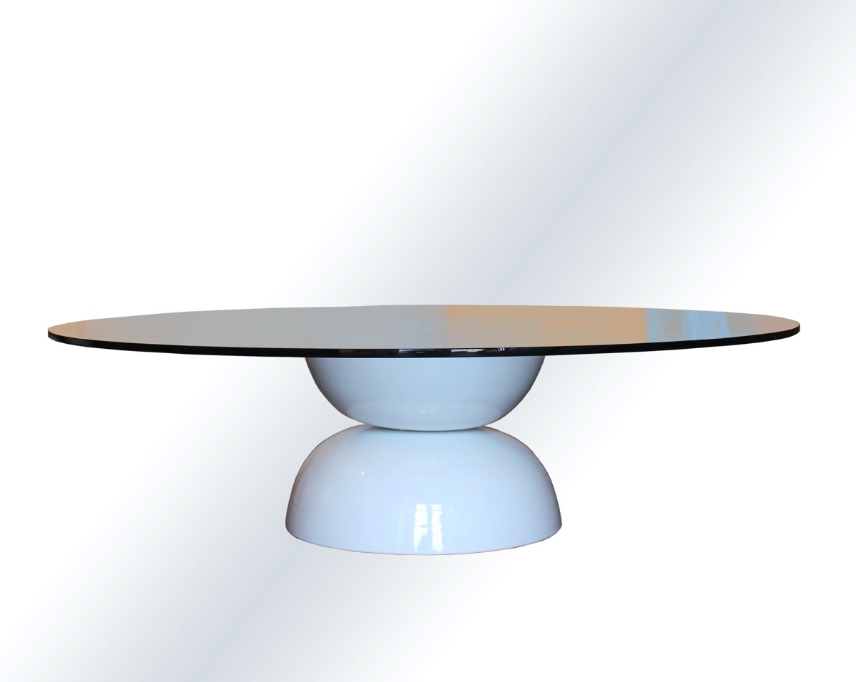 Round table with turned ceramic base and handmade glass top.